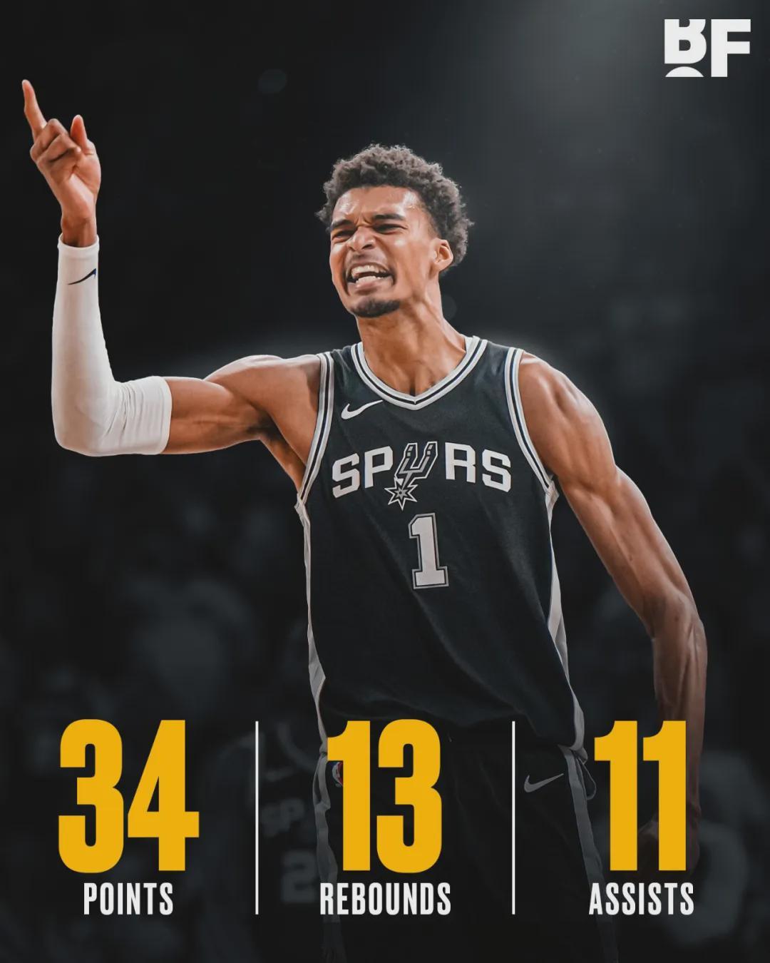 新秀赛季,文班亚马打了71场常规赛,场均21.4分10.6篮板3.9助攻1.2抢断3.6盖帽3.7失误,三项命中率:46.5%,32.5%,79.6%。他是自马努特-波尔之后,首位在新秀赛季拿到盖帽王的球员。文班需要做的,就是保持健康。